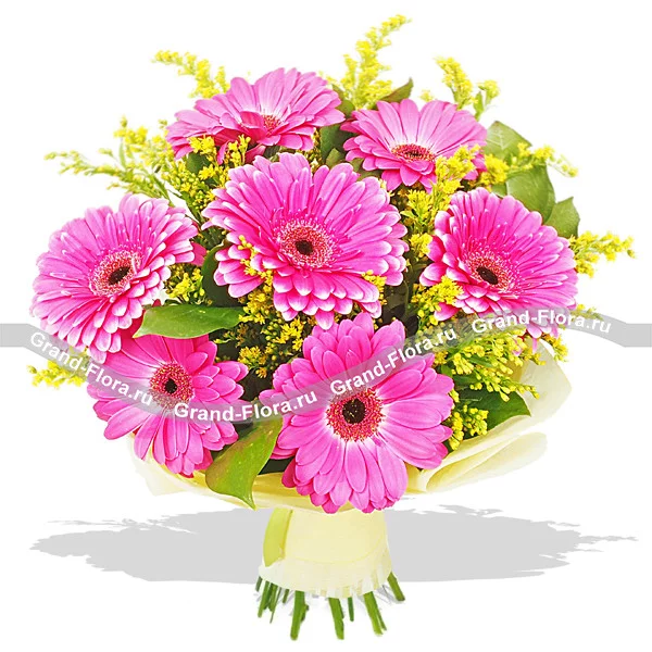 Стандартный (на фото): гербера малиновая - 7 шт, солидаго - 5 шт, рускус, фетр светло-желтый.