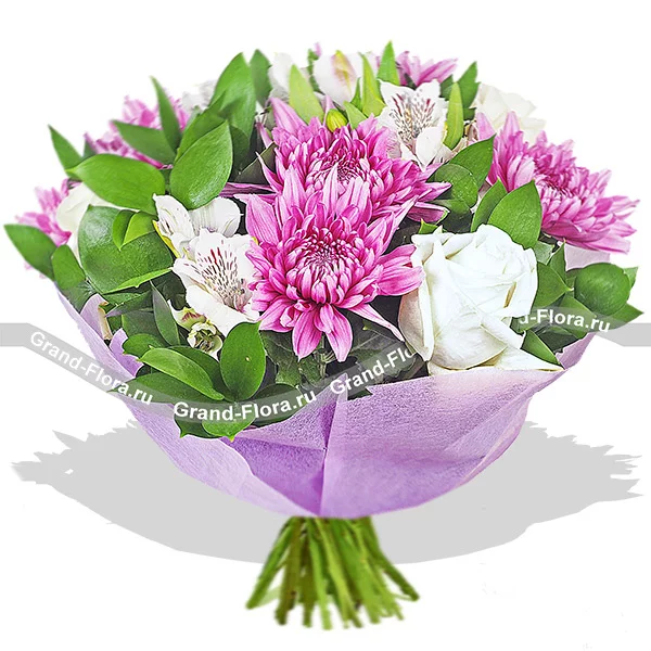 Очаровательный букет, собранный из белых роз и альстромерий, одноголовых фиолетовых хризантем, удачно оформлен с помощью фетровой обертки в тон цветам.