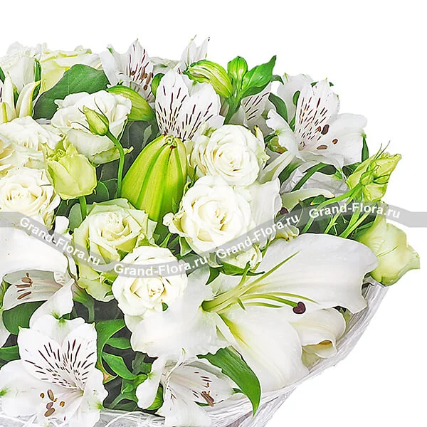 Воплощенная нежность и изящность букета, не может остаться незамеченной. Словно белое платье невесты, букет завораживает нежностью и невинностью.  Наполненный альстромериями, лилиями, эустомами и розами кристально – белых оттенков, он дарит ощущение невесомости и свободы, которое остается в глубине самого сердца.