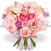 Стандартный: роза розовая - 3 шт., тюльпан розовый - 4 шт., роза кустовая розовая - 6 шт., статица,эвкалипт, лента.
