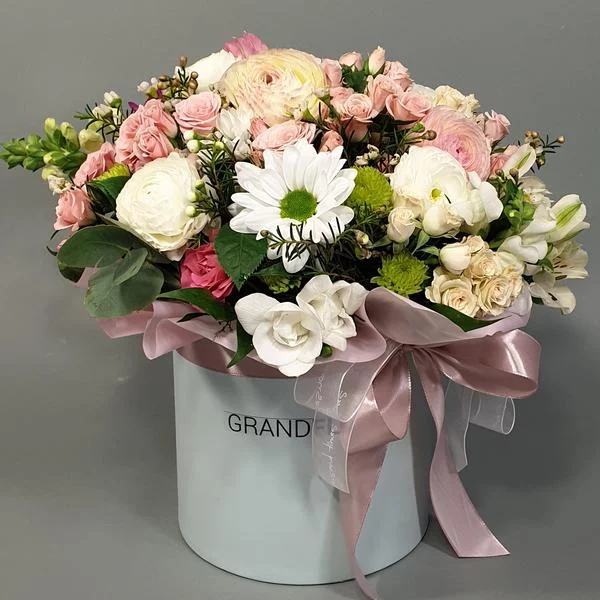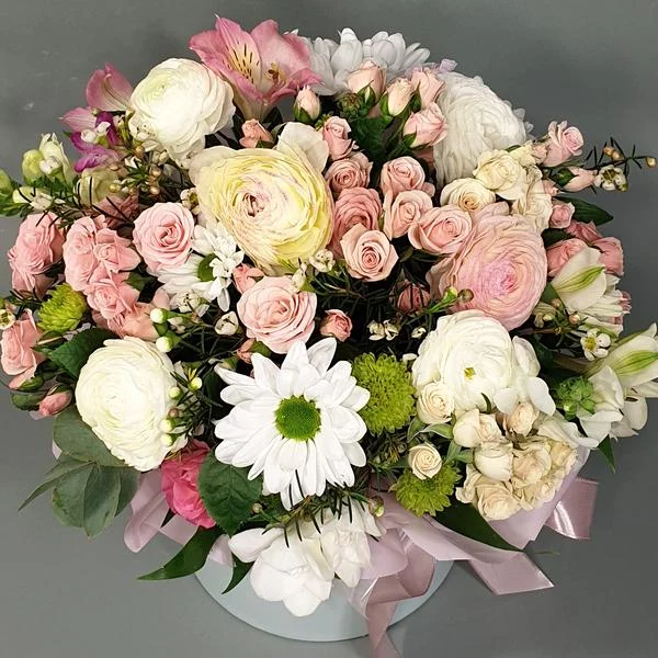 Стандартный: роза розовая - 3 шт.,  роза белая - 3 шт.,  кустовая роза розовая - 4 шт., кустовая роза белая - 3 шт., хризантема кустовая ромашковая  белая - 1 шт., альстромерия белая - 2 шт.,  альстромерия розовая - 1 шт., декоративная зелень (хамелациум,львиный зев/возможна замена), оазис, коробка.